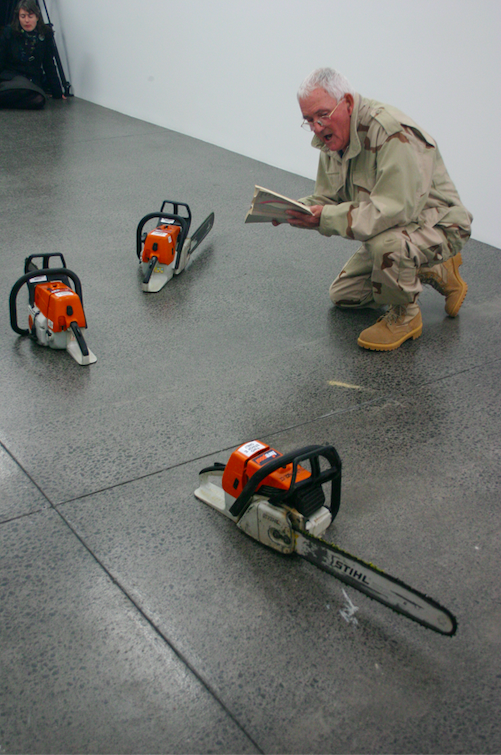 Allen’s own work evolved from a relatively traditional object-based practice of the 1950s and 1960s encompassing work in metal, wood, plaster, concrete, ceramics and stained glass, including major public commissions such as the Futuna Chapel altarpiece and windows (1961) and the Hocken Library mural (1967), to more process-focused experimental work following his 1968 sabbatical. Significant installation works such as the ‘Small Worlds’ project (1969), New Zealand Environment No. 5 (1969), Arena (1970), the two-part O-AR (1975), and the three-part performance work Contact (1974) all acted as participatory experiments in sensory experience, perception and cognition, investigating relations between bodies, materials and technology. These experiments were extended in a set of performance works Allen made in 1976 while on residency at the Experimental Art Foundation in Adelaide, including Poetry for Chainsaws, Newspaper Piece and On Planting a Native.
