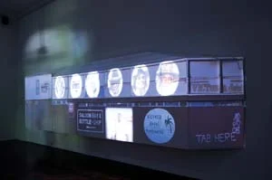 Sohan Ariel Hayes & Michael Woodley, Birndi Wirndi – Worlds Apart, 2010, dual channel HD video, PAL. with 2-channel audio, stereo, 14 mins duration archival vi deo, images, text, architectural model (foamcore and inkjet print), 8 x 3.5m; installation view, Spaced: art out of place, Fremantle Arts Centre, Perth, 2012; image courtesy the artists