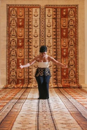 Ruha Fifita performing traditional Tongan dance in the exhibition ‘Siu i Moana: Reaching Across the Ocean’, NGV International, Narrm Melbourne, June 2016; photo: Wayne Taylor