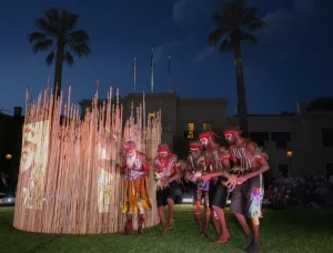 Kulata Tjuta Project, installation and inma (ceremony) view, Government House, Adelaide, 9 October 2015; commissioned for ‘TARNANTHI: Festival of Contemporary Aboriginal and Torres Strait Islander Art’; image courtesy the Art Gallery of South Australia, Adelaide, and Ernabella Arts, Iwantja Arts, Kaltjiti Arts, Mimili Maku Arts, Ninuku Arts, Tjala Arts and Tjungu Palya; photo: Ben Searcy