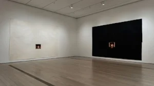 Toba Khedoori, exhibition installation view, Los Angeles County Museum of Art, 2016–17, with (from left): Untitled (white fireplace), 2005, and Untitled (black fireplace), 2006; © Toba Khedoori: photo: © Fredrik Nilsen